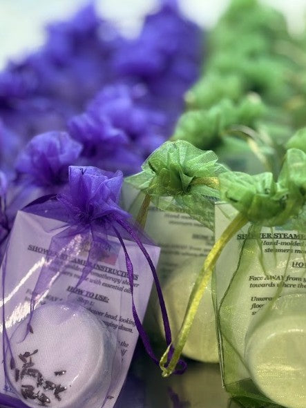 Single Shower Steamer bulk orders include one (1) individually packaged and labeled shower steamer with how-to-use-your-shower-steamer instructions card and business card.
